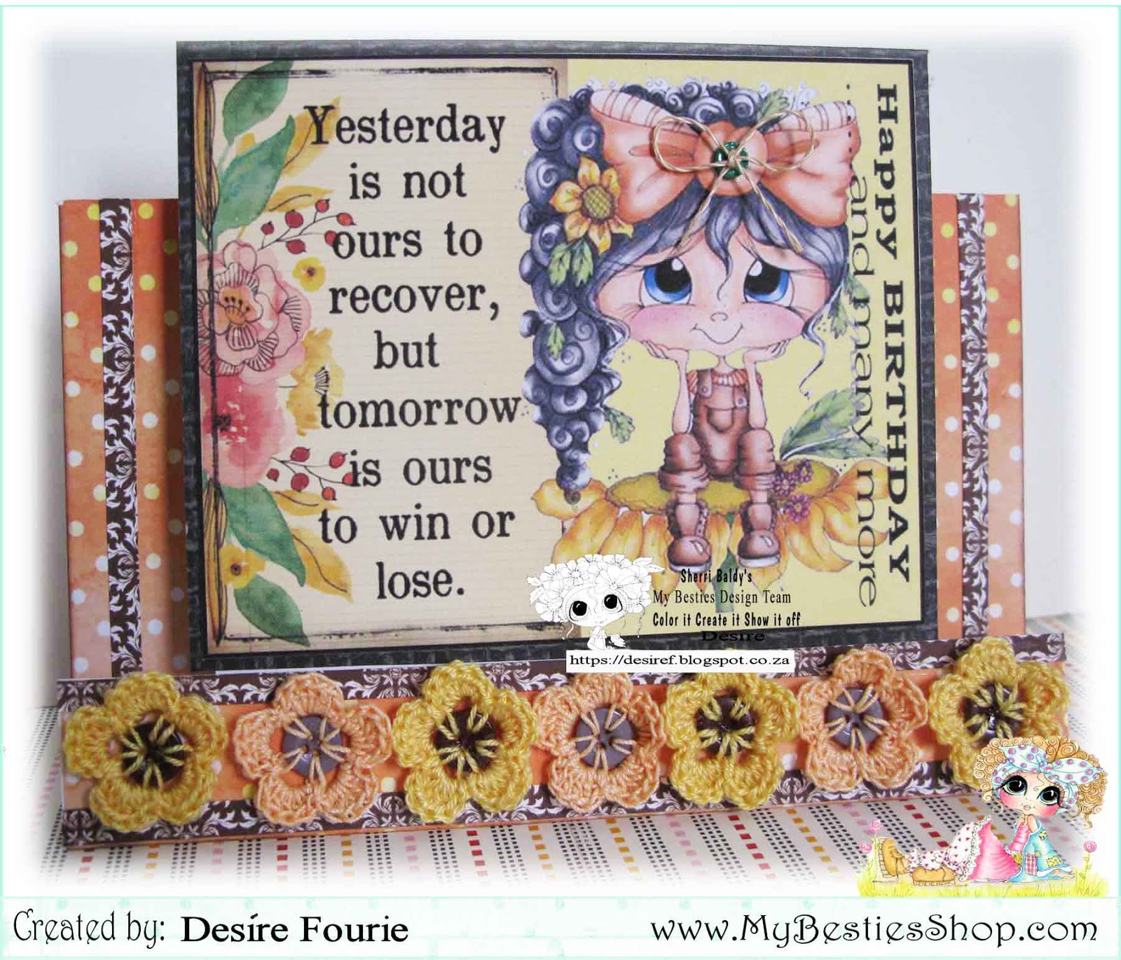 ReplyDeleteSuch a sweet image and wonderful sentiment! Those crochet flowers are gorgeous! Lovely to have a button as the centre! A beautiful card Desire! Thanks for sharing it with us at Penny's Paper-Crafty Challenges!
